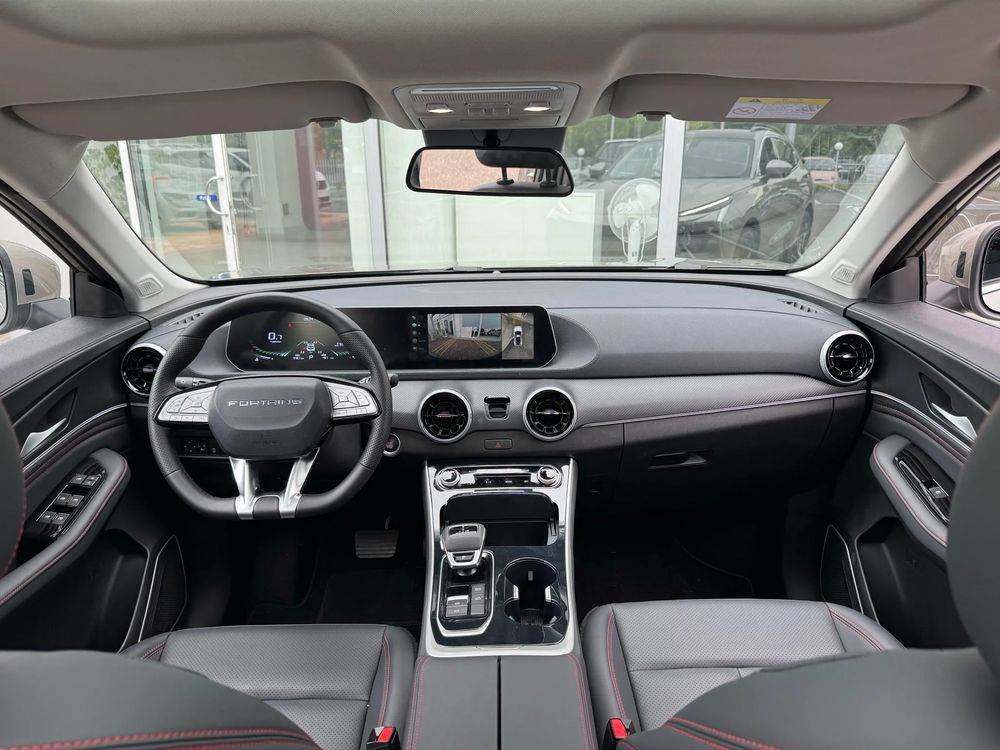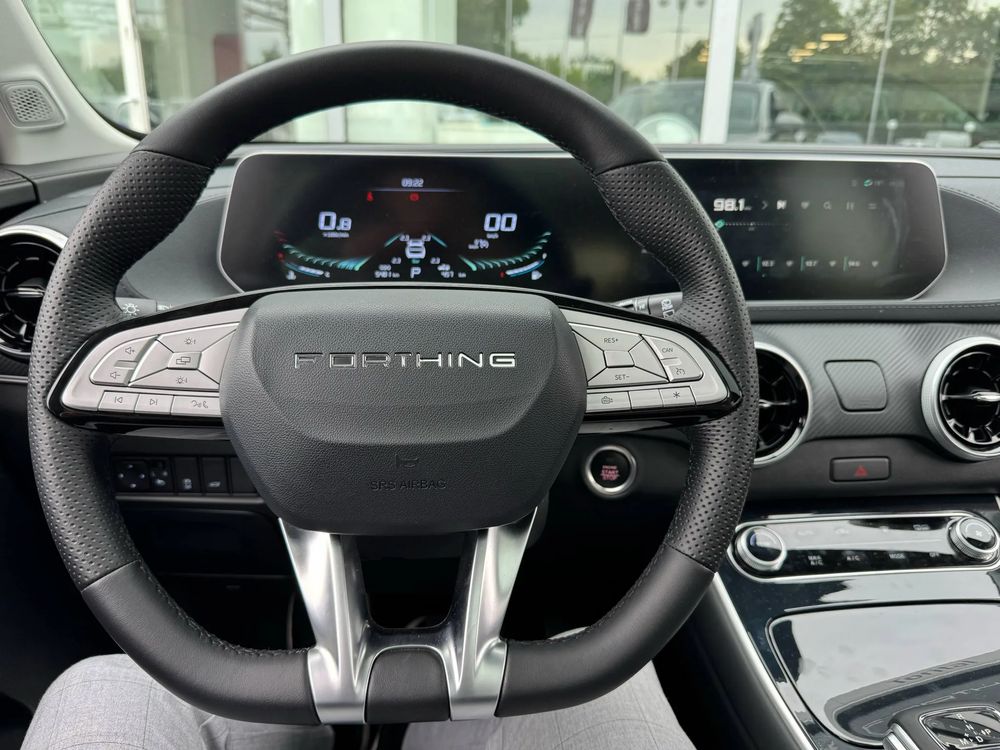 Forthing T-FIVE wyróżnia się dynamiczną a jednocześnie elegancką linią boczną. Przedni zderzak z dużymi wlotami powietrza ma zuchwałe, ostre linie, które nadają T-FIVE agresywny i nowoczesny wygląd. Wyrazisty grill z chromowanymi elementami dodaje elegancji. Tylna część nadwozia z podwójnymi końcówkami wydechu inspirowana jest bolidami F1 i sprawia, że Forthing T-FIVE wygląda sportowo. Duże, 19-calowe koła podkreślają jego odważny charakter.